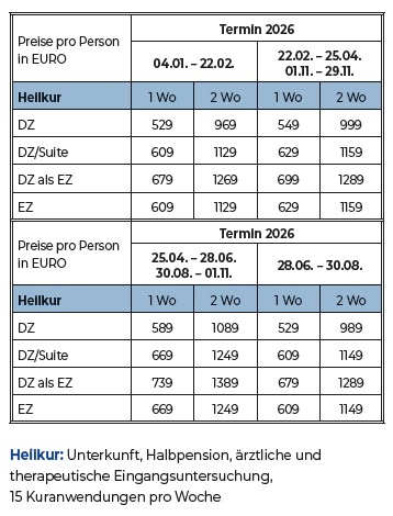 den Gästen ein kleines Gradierwerk für Atemwege zur Verfügung. Zu den Radonbädern (gegen Extrazahlung), im Radonbad sind es etwa 10 Gehminuten. Die bequemen und geräumigen Zimmer sind mit Dusche/WC, TV-Sat, Kühlschrank, Telefon, Fön, Internet und Safe (gegen Gebühr) ausgestattet. Zimmer Kategorie Suite sind geräumiger und haben zusätzlich eine Sitzecke. Bademantel kann gegen Bezahlung ausgeliehen werden. Die Mahlzeiten werden in einem schönen hauseigenen Restaurant eingenommen. Das Haus bietet seinen Gästen: Rezeption, Lift, Speisesaal, Café mit Terrasse, Garten mit direktem Zugang zum Kurpark, Sole-Whirlpool und einen kostenfreien videoüberwachten Parkplatz. Einbewachter Parkplatz, gebührenpflichtig, liegt etwa 5 Gehminuten entfernt.