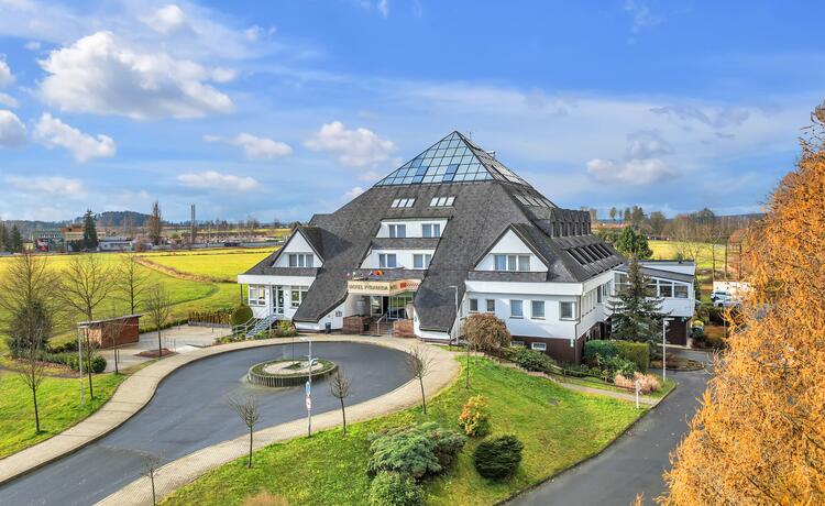 Das Kurhotel Pyramida**** liegt in ruhige Lage in Franzensbad, nur ca. 10-15 Gehminuten von den Kolonnade und Kurzentrum entfernt. Die geschmackvoll ausgestatteten Zimmer verfügen über Dusche/WC, TV-Sat, Minibar, Fön, Safe, Bademantel, Hausschuhe und Internet. Zimmer Kategorie Superior sind mit Balkon und liegen in 1. oder 2. Etage. Die ärztlichen Untersuchungen und alle Kuranwendungen werden in der hauseigenen modernen Therapie und Wellness-Abteilung durchgeführt. Hier steht Ihnen ein Hallenbad (ca. 6 x 8 m, ca. 30 °C) mit Gegenstromanlage, Whirlpool, Fitnessraum, eine Finnische- und Bio-Sauna zur Verfügung. Während der Öffnungszeiten ist die Benutzung für Hotelgäste kostenfrei. Die Mahlzeiten werden im gediegenen Hotelrestaurant eingenommen. Das Haus verfügt über: Rezeption, Lift, Restaurant mit Terrasse, Fahrradverleih, Nordic-Walking-Verleih und Sommerterrasse. Parken in der hauseigenen Tiefgarage oder Parkplatz gegen Bezahlung möglich.