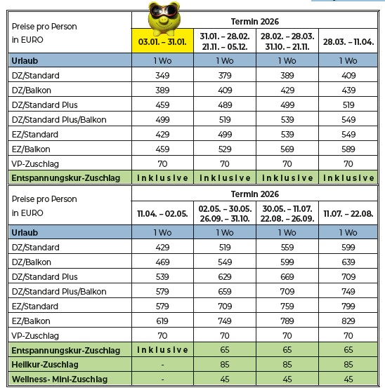 Kurtaxe/Ortsgebühr ist nicht im Preis inbegriffen und ist vor Ort zu zahlen.