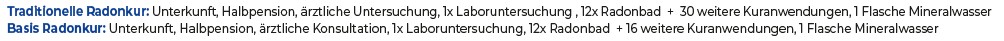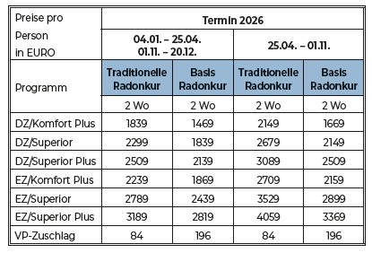 Das Kurhotel Radium Palace**** befindet sich inmitten eines großen Waldparks. Die Zimmer verfügen über Bad oder Dusche/WC, TV-Sat, Telefon, Minibar, Fön, Safe, Internet und Bademantel. Zimmer Kategorie Superior sind geräumiger mit Talblick und Zimmer Kategorie Superior Plus haben einen Talblick und täglich 0,7 l Flasche Sprudelwasser auf dem Zimmer, sowie die Verpflegung á la carte im "Blaues Restaurant". Das moderne Haus bietet seinen Gästen: Rezeption, Lift, Speisesaal, Cafe, Konzertsaal, Tanzbar, Friseur, Kosmetik, Pediküre, Wechselstube, Sommerterrasse, Fahrrad- und Skiraum. Alle ärztlichen Untersuchungen und Kuranwendungen werden direkt im Haus verabreicht. Einen Hallenbad ca. 13 x 6 m, ca. 30 °C, Whirlpool, Kneippanlage, Sauna, Trockensauna und Infrarotsauna steht für die Hotelgäste kostenlos zur Verfügung. Eine weitere Schwimmmöglichkeit (gegen ermäßigte Gebühr) besteht im neuen Aquacentrum "Agricola" (mit Hallenbad 25 x 6 m, Sauna und Salzgrotte), etwa 300m von Kurhotel entfernt. Die Mahlzeiten werden von den Gästen im hauseigenen Speisesaal eingenommen. Einen Parkplatz (gegen Gebühr) ist ca. 150m vom Haus entfernt.