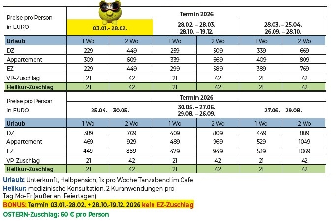 Kurtaxe/Ortsgebühr ist nicht im Preis inbegriffen und ist vor Ort zu zahlen.